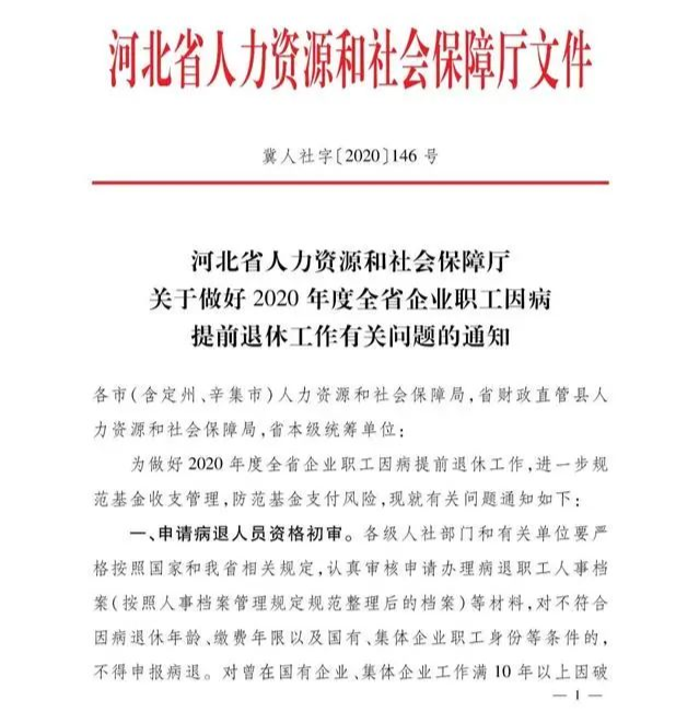 5月29日,河北省人社厅官网发布了《河北省人力资源和社会保障厅关于做好2020年度全省企业职工因病提前退休工作有关问题的通知》。
